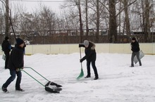После очередного снегопада учащиеся 8А и 8Б классов вышли на уборку школьной хоккейной коробки.