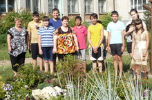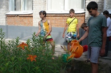 Учащиеся 7А и 8А классов поливают клумбы с цветами, посаженные в рамках акции "Посади цветок своими руками". -
