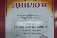 Учителя нашей школы, педагог-организатор Матвеева С.В. и учитель ИЗО Матвеева Т.А., участвовали во Всероссийской олимпиаде "Подари знание". Итоги: Матвеева С.В. - 1 место ("Современные педагогические технологии для реализации требований ФГОС"), 3 место ( "Профессиональный стандарт педагога"), 3 место ("Правовая компетентность педагога"); Матвеева Т.А. - 2 место ("ФГОС основного образования"). Поздравляем!