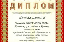 Поздравляем команду школы № 24, занявшую первое место в районной Спартакиаде обучающихся по военно-прикладным видам спорта, посвящённой Дню защитника Отечества «А ну-ка парни». Руководитель А. К. Подкопаев.