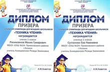 Ученики 1Б класса Рахимзянов Малик и Султанова Ева (учитель Ахмеджанова Р.З.), стали ПРИЗЁРАМИ Республиканской олимпиады для младших школьников «Техника чтения». Умнички! Поздравляем! Так держать!