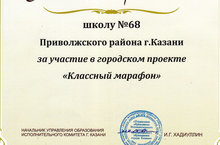 22 декабря состоялась церемония закрытия городского проекта "Классный марафон", в котором принимали участие 173 школы города.От нашей школы в проекте выступал 7Б класс, командир Миннулина Зарина, классный руководитель Гаврилова В.А., который вошел в десятку лучших и былнагражден грамотой Городского управления. Молодцы! Это большая победа. Спасибо всем, кто голосовал за нас.