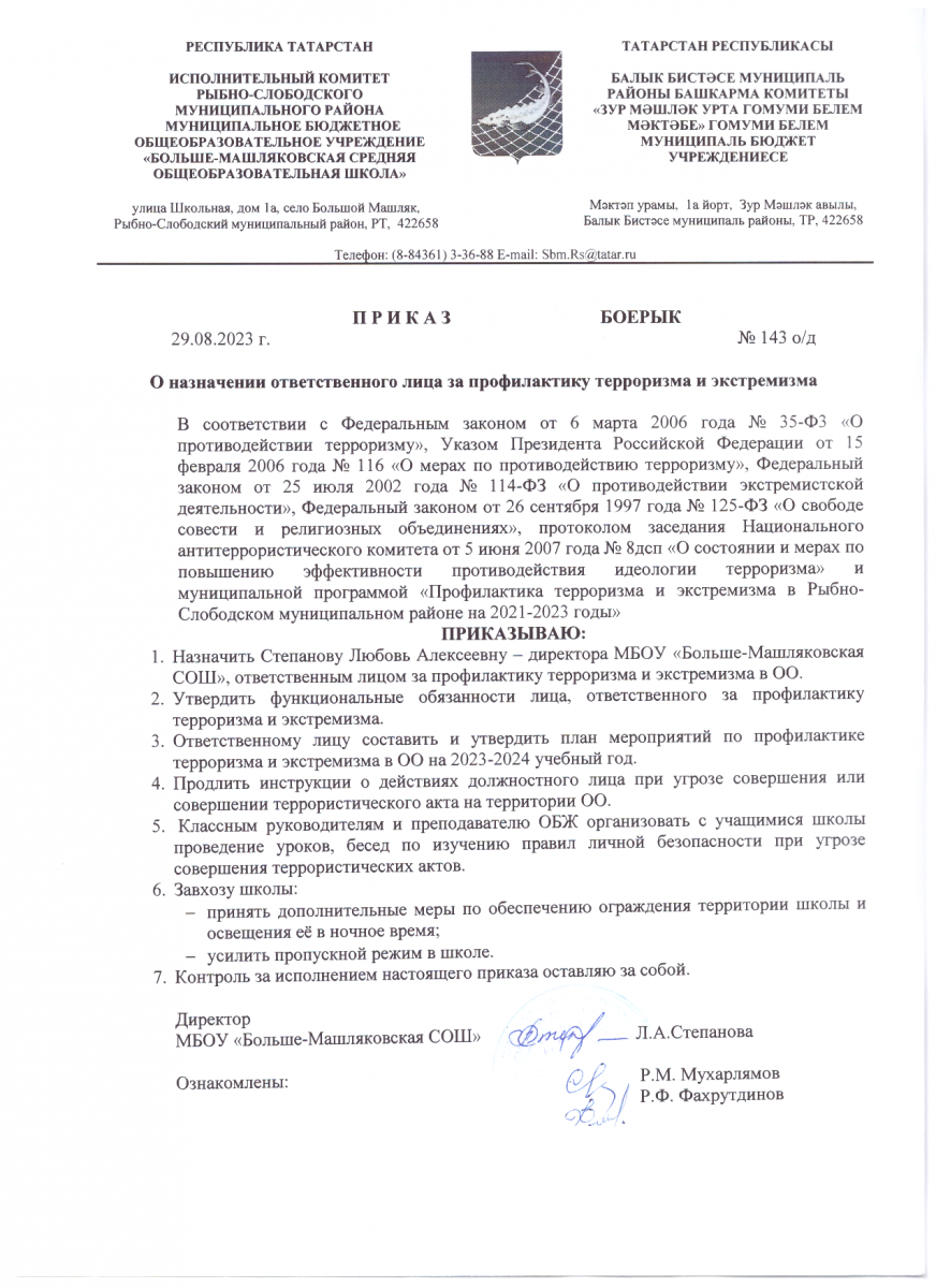 Приказ о назначении ответственного лица за профилактику терроризма и экстремизма