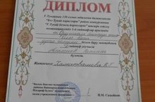 5 апрель көнне район балалар иҗаты үзәгендә "Давайте,люди,никогда об этом не забудем"дигән конкурс - слет булды.Бу конкурста безнең укучыбыз Хабибуллин шигырь укучылар арасында "За эмоциональность"номинациясендә җиңү яулады.Укучыга һәм аның җитәкчесе Мубаракшина А.А.- га рәмәт белдерәбез һәм уңышлар телибез.