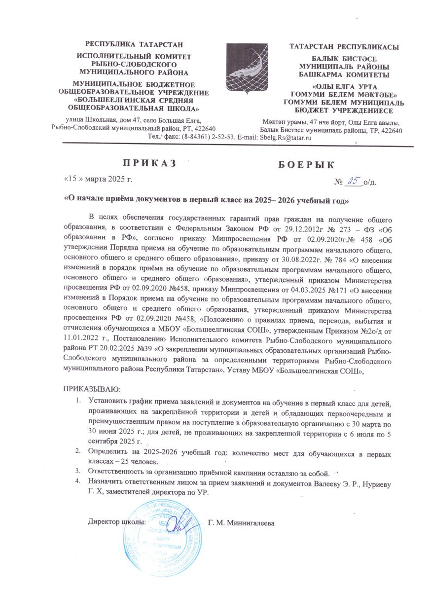 Приказ «О начале приёма документов в первый класс на 2024– 2025 учебный год»