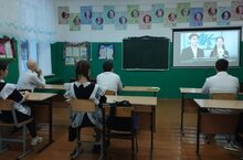 Учащимся показали видеоинтервью с ветераном Великой Отечественной войны Константином Федотовым и Героем России, участником спецоперации Николаем Соколовым.