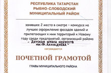 Коллектив Детской школы искусств занял 2-ое место по итогам муниципального конкурса на лучшее новогоднее оформление фасада здания организации и прилегающей территории. В этом году сотрудники ДШИ приняли участие в оформлении двух площадок - перед своим зданием и на набережной реки Кама. Преподаватели и обучающиеся отделения изобразительного искусства создали две скульптурные ледяные группы сказочных персонажей. На районном празднике посвященном встрече Нового года коллективу была вручена Почетная грамота Главы района.