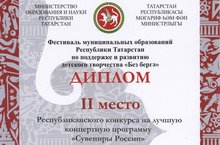 1-2 июня 2016 года на территории выставочного центра «Казанская ярмарка» прошел Республиканский фестиваль муниципальных образований по поддержке и развитию детского творчества «Без бергә», 3-й год подряд организуемый Министерством образования и науки Республики Татарстан. На фестивале приняли участие более 1400 обучающихся общеобразовательных организаций, организаций дополнительного образования детей и организаций среднего профессионального образования муниципальных районов Республики Татарстан в возрасте от 10 до 18 лет. По итогам фестиваля и всех соревнований, ярмарок, фестивалей и слетов наш район вошел в число призеров. В выставке декоративно-прикладного творчества «Сувениры России» были представлены работы МБУДО «ДШИ им. Ф. Ахмадиева» (педагог дополнительного образования Якупова Ф.Х.), МБОУ ДОД «ЦДТ» (педагог дополнительного образования Фаттахова Р.С. – МБОУ «Большеелгинская СОШ», педагог дополнительного образования Шайдуллина Г.Х. - МБОУ ДОД «Биектауская СОШ», Широбокова Д. – МБОУ «Шумбутская СОШ», педагог дополнительного образования Каримуллина Э.Р. – МБОУ ДОД «ЦДТ»), по итогам которой наш район занял 3-е место. В концертной программе "Сувениры России" (Рыбно-Слободский район – 2 место) приняли участие хореографические коллективы «Рапсодия» МБУДО "Детская школа искусств им. Ф.Ахмадиева" (Обладатель Гран-При фестиваля «Совездие-Йолдызлык – 2016», руководители Фасхутдинова Е.Р. и Гаврилова С.В.), «Камские звездочки» (Призер фестиваля «Совездие-Йолдызлык – 2016», руководитель Сафина А.М.), солисты Тимофеева Анастасия (Призер фестиваля «Совездие-Йолдызлык – 2015»), ведущие Мишин Станислав и Валиахметова Сюмбель (МБУДО «ДШИ им. Ф. Ахмадиева, руководитель Банницын В.В.), Каримова Алина (руководитель, зам по УВР МБОУ «Ямашевская СОШ» Мубаракшина Д.И.).