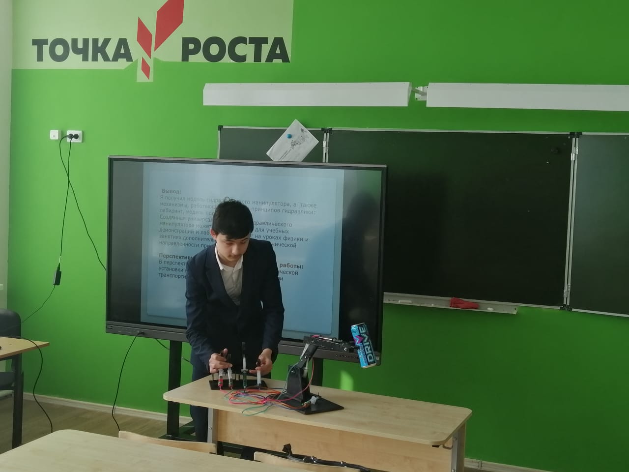 26 марта на базе МБОУ " Рыбно- Слободская гимназия 1" состоялась муниципальная научно- практическая конференция "Мастера исследований". Ученики защищали свои работы. Все ребята выступили достойно. Большой интерес привлекла работа гимназиста Ситдикова Ильяса, ученика 8А класса "Использование гидравлических манипуляторов в создании роботов". Он изготовил модель манипулятора, рассказал какие материалы использовал для его создания и продемонстрировал его в действии.