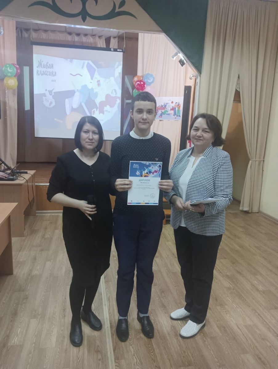 Балалар иҗат үзәгендә «Тере классика» Бөтенроссия укучылар конкурсы үткәрелде. Барлыгы 33 укучы катнашты. Конкурста проза әсәреннән өзек сөйләргә иде. Гимназиядән Мөхәммәдҗанова Ралинә, Гарипов Фәнис (җитәкче Крюкова Л.Ю.), Маслова Надежда (җитәкче Чеботарева Н.Н.). Маслова Надежда җиңүче булды һәм Республика турына чыкты. Надяны котлыйбыз һәм уңышлар телибез!
