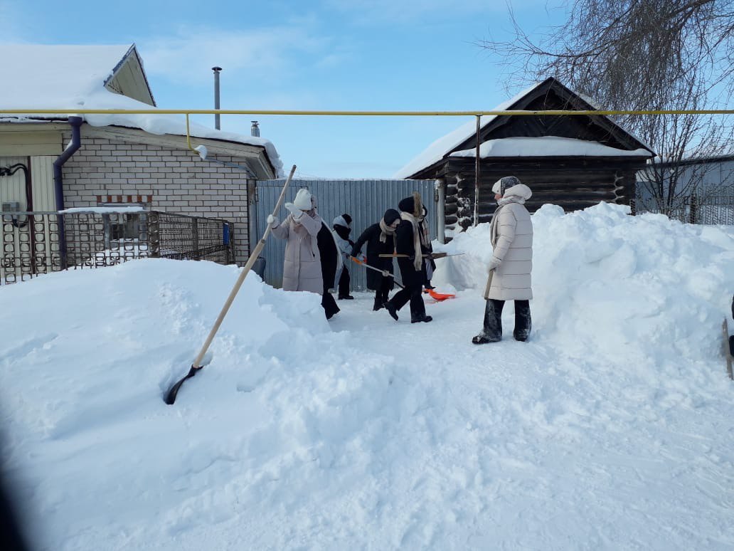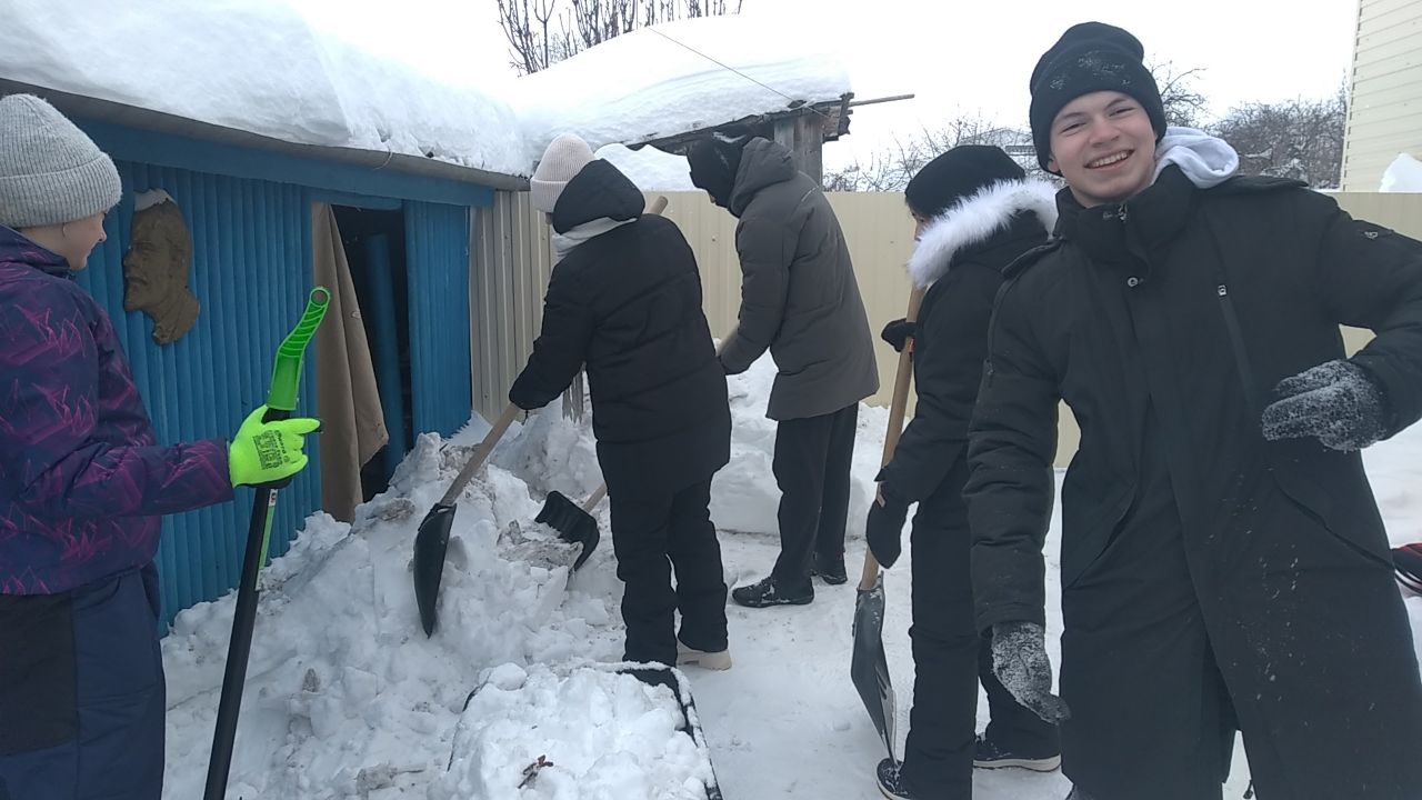 Ученики 7А класса, вооружившись лопатами, дружно убирали скопившийся во дворах снег, расчищали дорожки к сараям, погребам, а также пути к дому снаружи. В ответ современные тимуровцы получили слова благодарности от наших ветеранов.