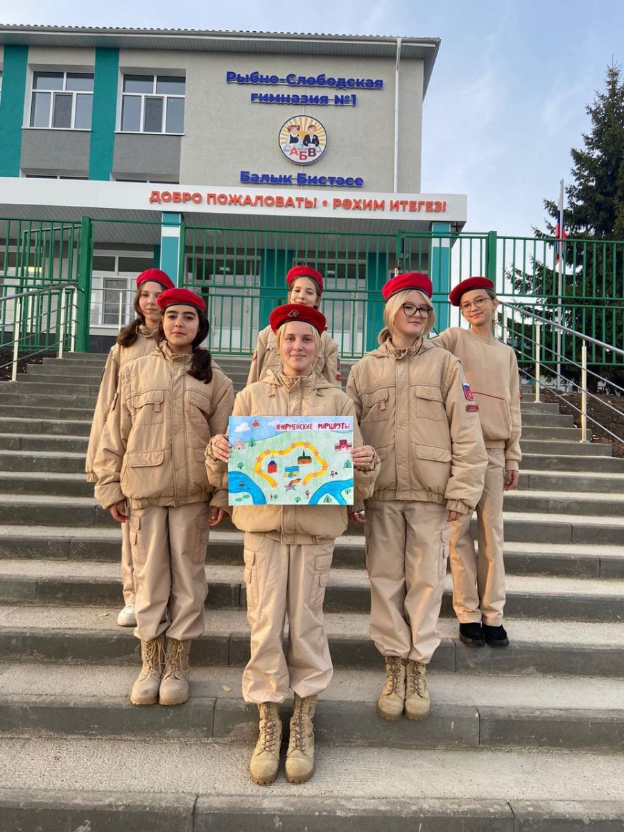 в Республику Татарстан, пгт Рыбная Слобода!♥️Балык Бистәсе 1 нче гимназиясенең «ЮНАРМИЯ» укучылары Хасанова А.И. җитәкчелегендә Балык Бистәсе урамнарына йөрергә чыгалар. Маршрут түбәндәге урыннарны үз эченә ала: