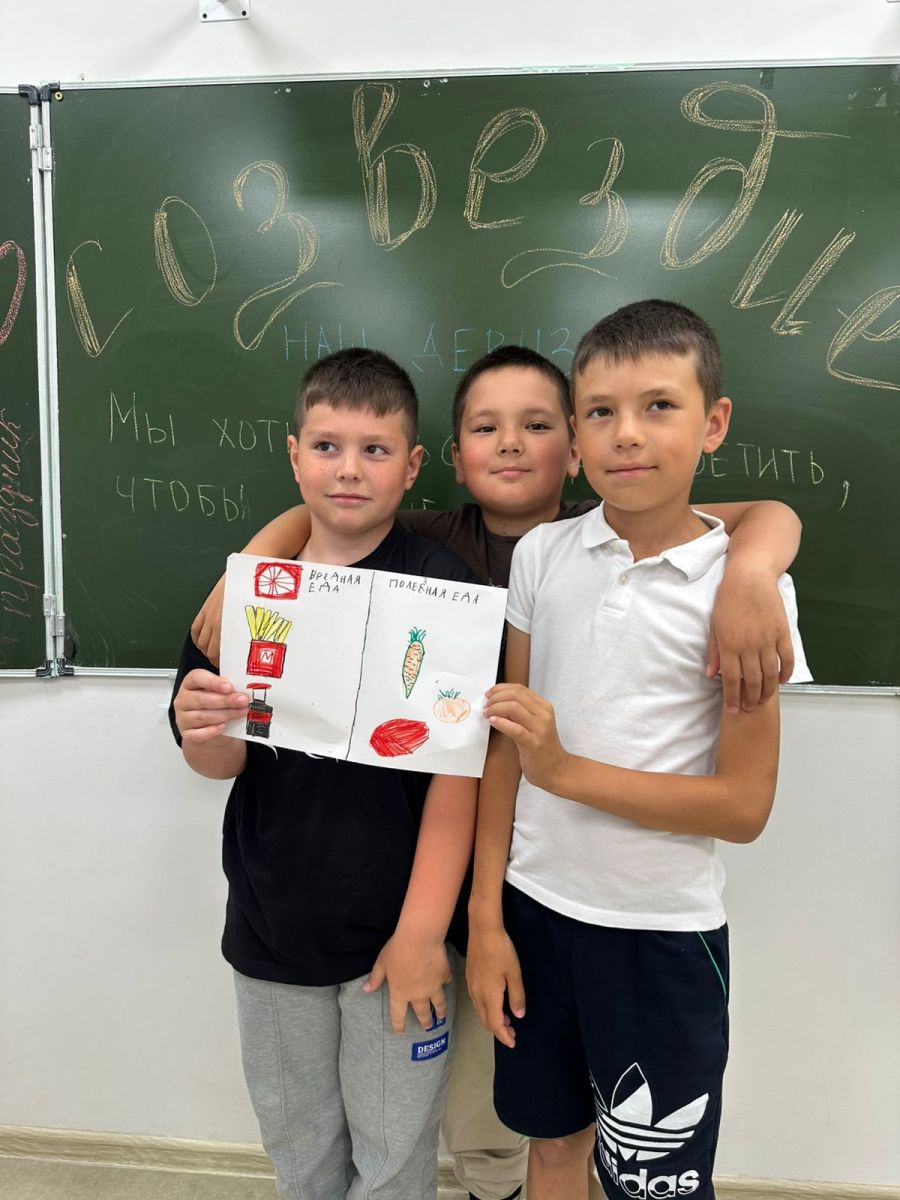 2. Мәгълүмати буклетлар ясау: эшнең икенче этабы сәламәт туклануга багышланган мәгълүмати буклетлар ясау булды. Катнашучылар үз буклетларын әзерләделәр һәм имзаладылар, аларны зарарлы ризык турында күрсәтмә материаллар (рәсемнәр), шулай ук аның сәламәтлеккә тискәре йогынтысы турында кыскача аңлатмалар белән тулыландырдылар. Әзер сурәтләр булмаган очракта, катнашучылар рәсемнәр ясап, үзләренең иҗади сәләтләрен күрсәттеләр.