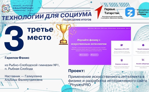 Победителем Республиканского конкурса технических решений в социальной сфере «Технологии для социума» стал: Третье место у Гарипова Фаниса — автора проекта "Применение искусственного интеллекта в физике и разработка интерактивного сайта "PhysicsPRO", Рыбно-Слободская гимназия №1", п. Рыбная Слобода.