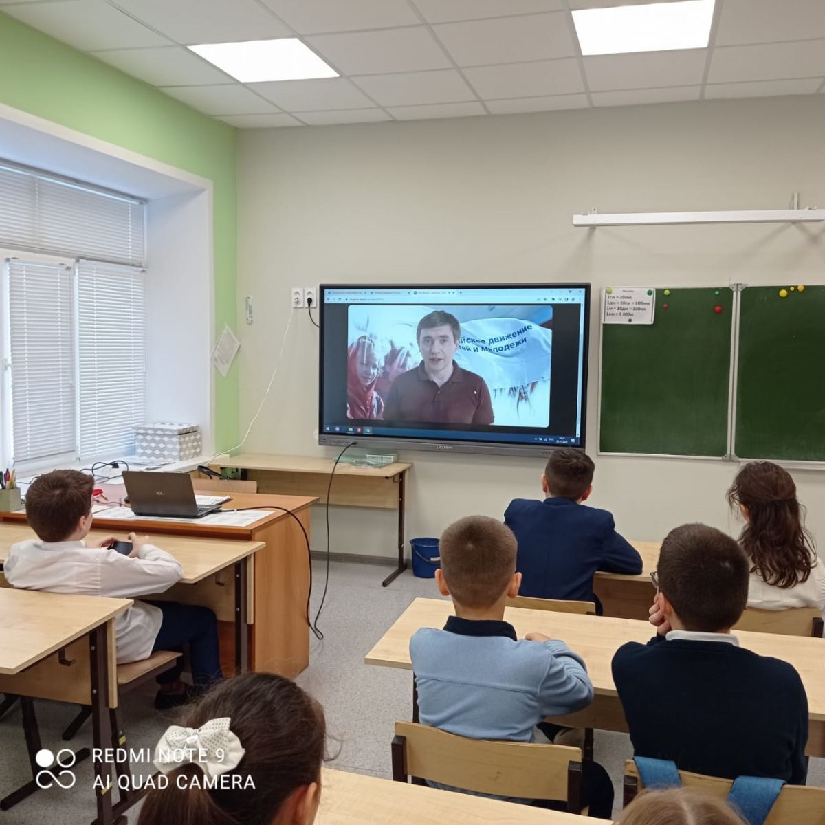 В этот понедельник учащиеся говорили о «Движении первых», которое направлено на создание условий для проявления активной гражданской позиции школьников; на формирование мотивации детей к общественно полезной деятельности. В разговоре с ребятами были затронуты вопросы о миссии и ценностях организации, обсуждены направления деятельности РДДМ через собственную вовлеченность. На занятии учащиеся посмотрели видеообращение председателя правления «Движения первых» – Григория Александровича Гурова.