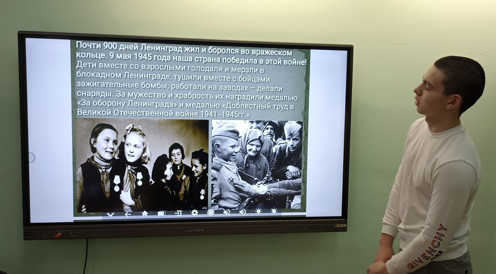 В ходе этих мероприятий ребята еще раз говорили о том, что такое блокада, смотрели фотоматериалы будней блокадного Ленинграда, получили представление о 40-километровой полосе по Ладожскому озеру, как ее называли «Дорогой жизни», связывающий блокадный город с продовольственными базами. Особенными чувствами прониклись к судьбе маленькой девочки Тани Савичевой. Ее дневник стал одним из символов Великой Отечественной войны. Кроме того, ребятам рассказали о подвигах обычных школьников, работающих на заводах, скидывающих вражеские бомбы с крыш многоэтажных домов.