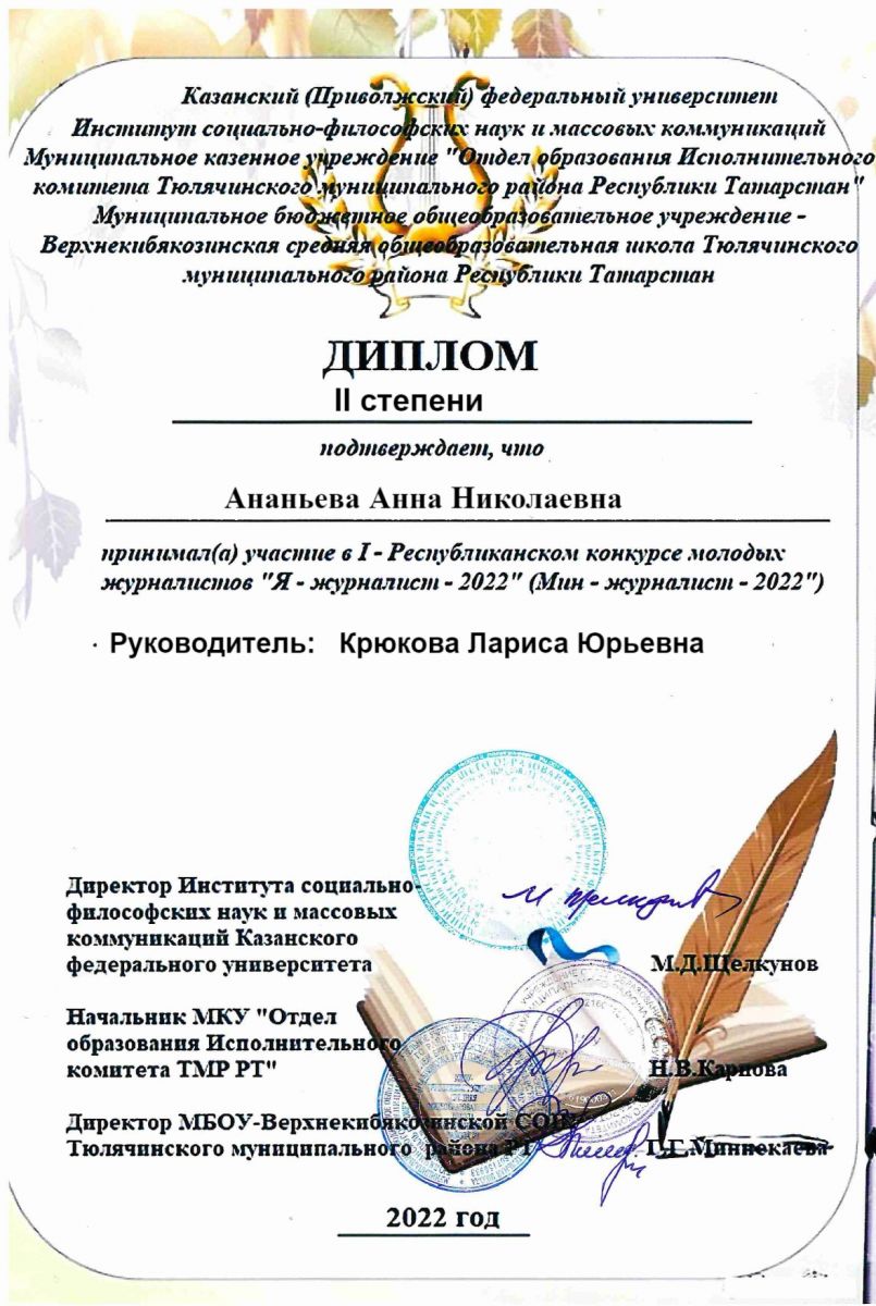 а видеосюжет Мухамедзяновой Ляйсан занял 1 место. Она была приглашена на чествование. В мероприятии приняли участие многие почетные гости: глава Тюлячинского муниципального района Н. Н. Хазипов; журналист, ученый, доктор филологических наук, профессор, заведующий кафедрой национальных и развитых медиа