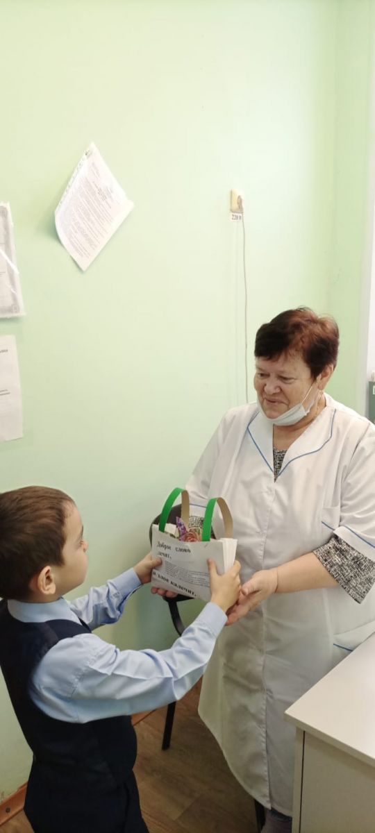 Ученики вместе с классным руководителем Сагировой А. И сделали сумочку добра. Положили в сумку пословицы о доброте, сладкие пожелания и подарили работникам гимназии.«Язгы игелек атналыгы» кысаларында 1Б сыйныфы укучылары Сагирова А.И. җитәкчелегендә «Игелек сумкасы» ясадылар. Аңа мәкальләр ябыштырып, эченә конфетлар салып гимназиянең хезмәткәрләренә бүләк иттеләр.
