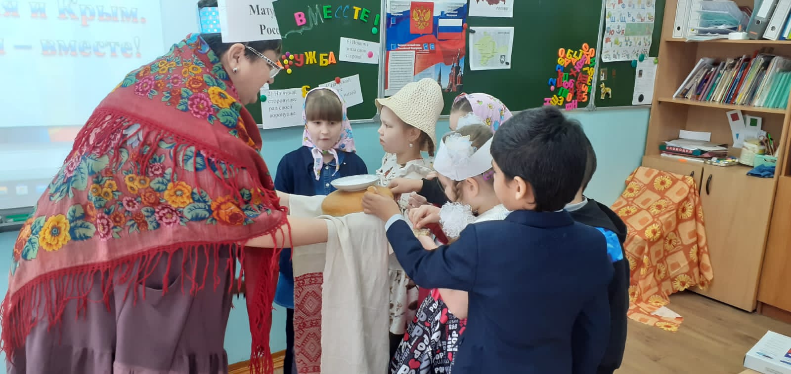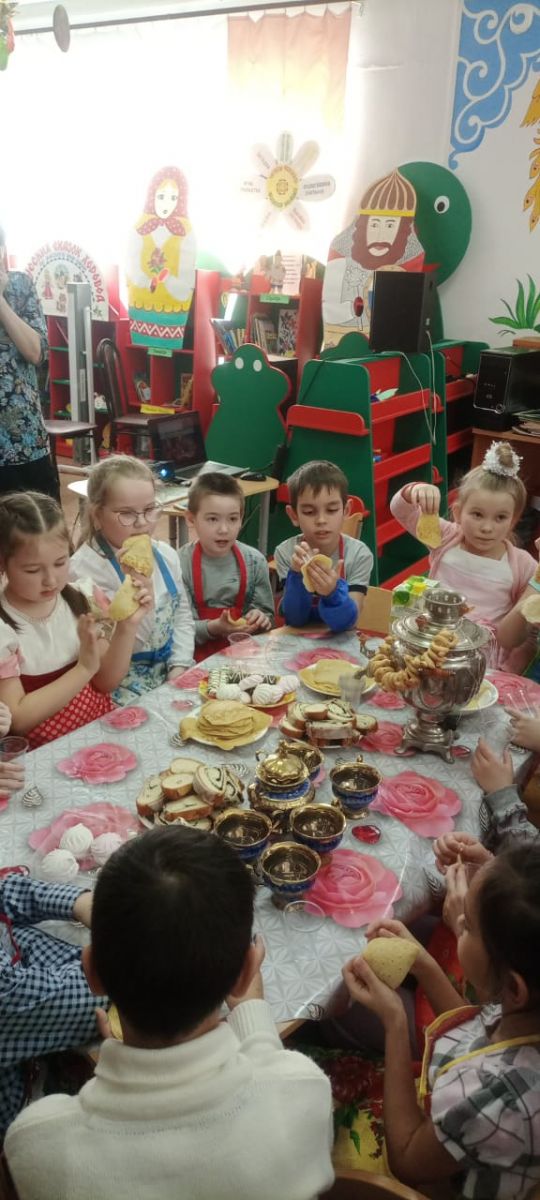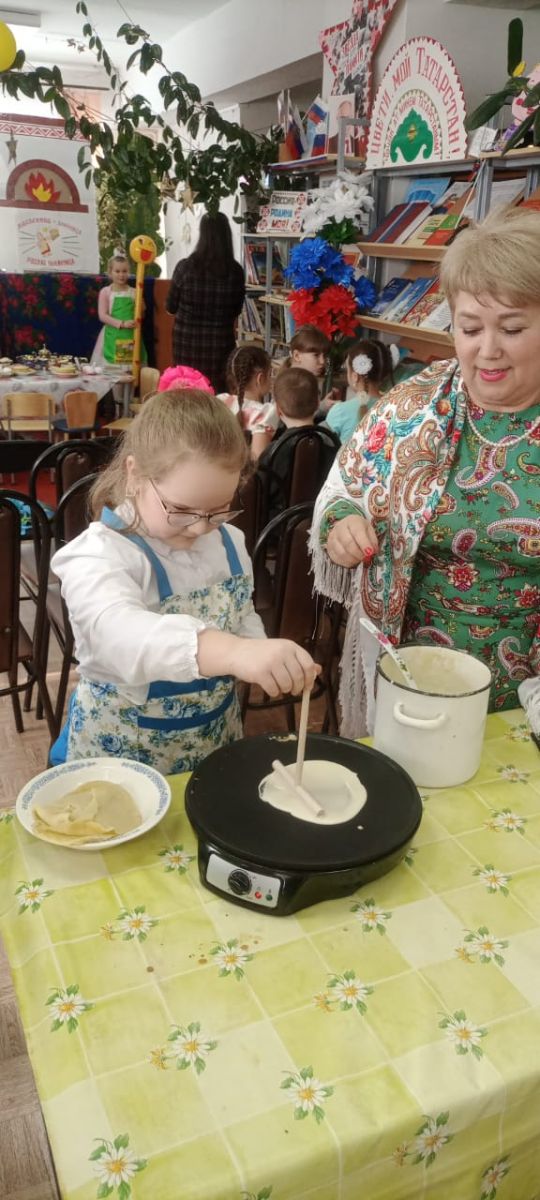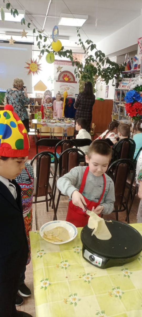 4нче мартта гимназиянең 1Б сыйныфы укучылары үзәк китапханәдә май чабу бәйрәмендә катнаштылар.