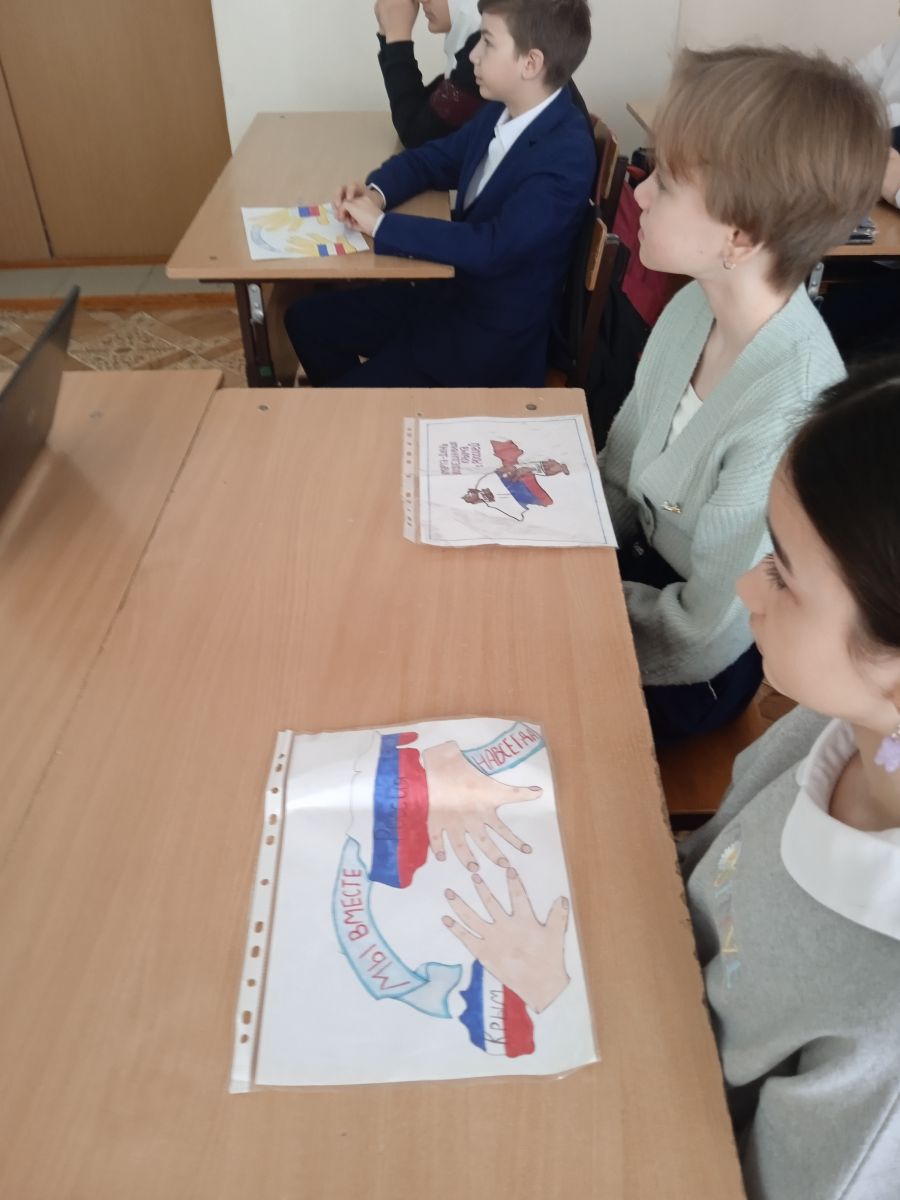 18 марта 2022 года в 1-11 классах нашей школы прошли классные часы «Крым и Россия – общая судьба», «Крым – путь домой», посвящённые годовщине воссоединения России и Крыма. Учащиеся узнали о событиях, предшествовавших воссоединению Крыма и России. Вместе с учащимися вернулись на несколько лет назад, вспомнив и о предыдущем референдуме, когда крымчане уже делали попытку остаться с Россией. Конечно же, не забыли и о более давней истории полуострова — Екатерина II, Крымская война, Советский Союз, Великая Отечественная война. Была затронута и тема «крымской нации» — пожалуй, именно так можно назвать всех тех, кто называет себя крымчанами, независимо от национальности, вероисповедания и взглядов, ведь Крым — это регион, где на протяжении веков всё смешивалось и роднилось, умиротворяясь удивительной природой и климатом полуострова.