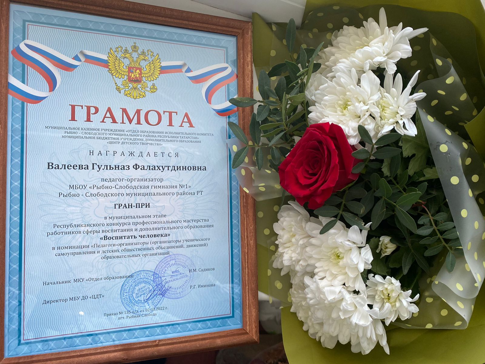 По итогам муниципального этапа Республиканского конкурса профессионального мастерства работников сферы воспитания и дополнительного образования «Воспитать человека» в номинации «Педагоги-организаторы» обладателем Гран-при стала педагог-организатор МБОУ «Рыбно-Слободская гимназия №1» Валеева Гульназ Фалахутдиновна. Поздравляем! Гульназ Фалахутдиновна проходит на зональный этап этого конкурса и уже будет представлять наш район. Желаем творческих успехов!!!