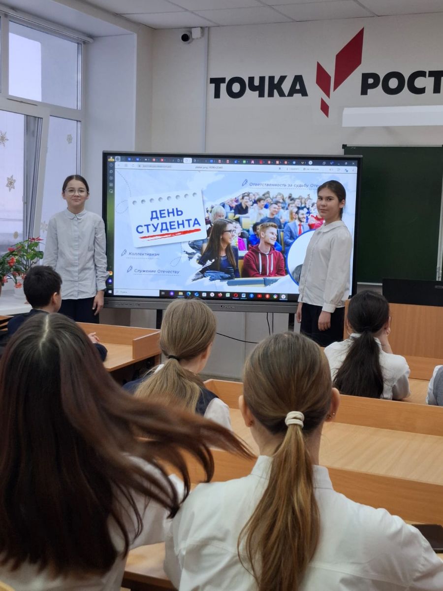 20 января 2025 года в МБОУ «Рыбно – Слободской гимназии №1» занятие внеурочного цикла «Разговоры о важном» было посвящено теме «День студента». Занятие направлено на формирование у обучающихся представлений о студенчестве как этапе взросления, о важности получения образования, об особенностях студенческой жизни и качествах, которыми должен обладать студент.