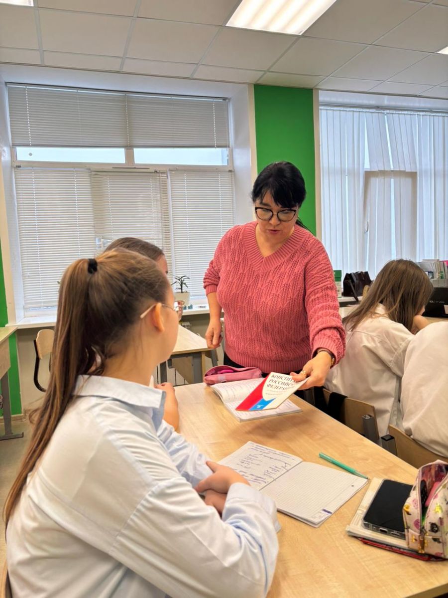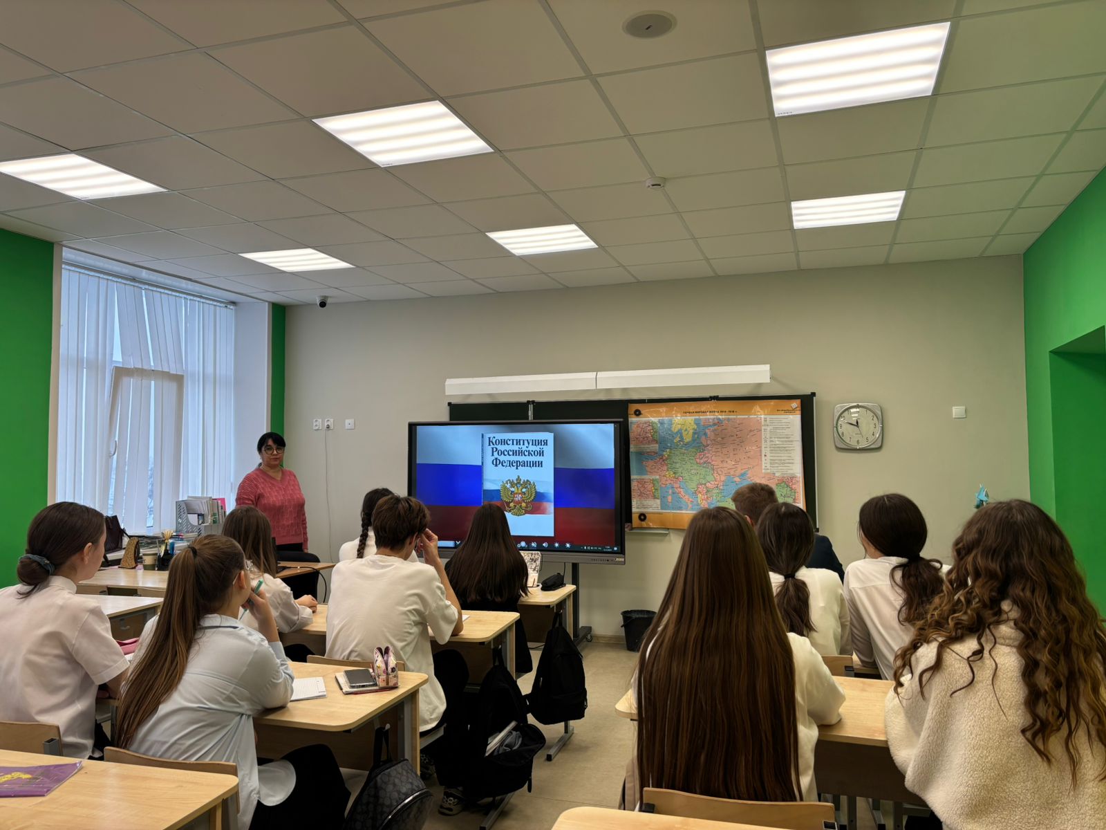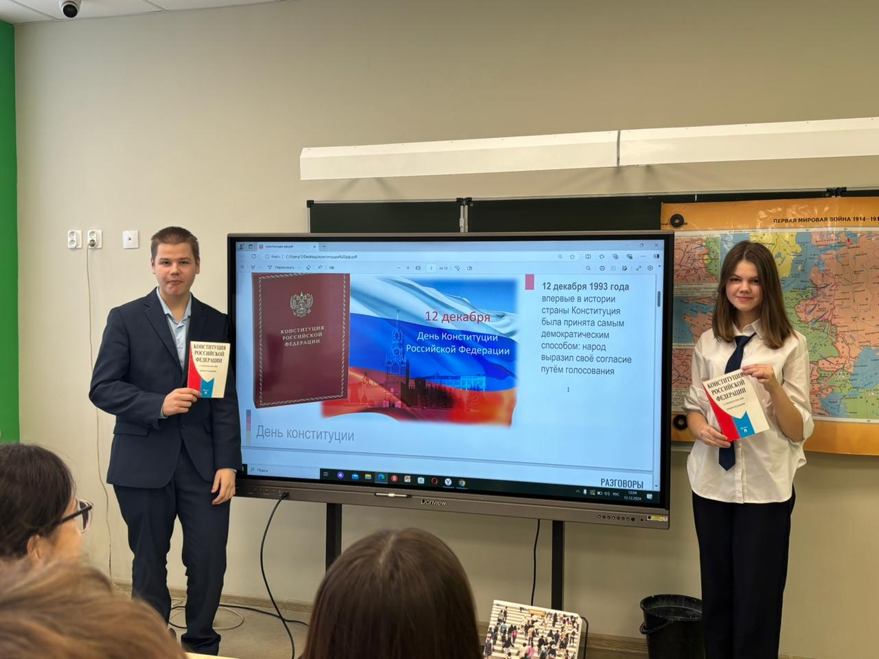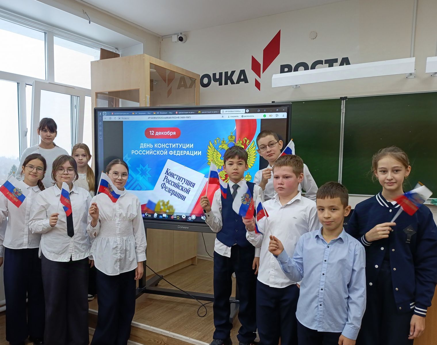 Тарих һәм җәмгыять белеме укытучысы Л.В. Сөнгатуллина укучылар өчен «РФ Конституциясе көне» дигән темага класс сәгате үткәрде. Балалар РФ Конституциясе барлыкка килү тарихы, аның структурасы белән таныштылар. Балалар илнең Төп Законын белү һәм дөрес куллану - цивилизацияле тормыш нормасы һәм аның сыйфатын күтәрү өчен мөһим шарт икәнен белделәр, Россия гражданнарының хокуклары һәм бурычлары турында фикер алыштылар.