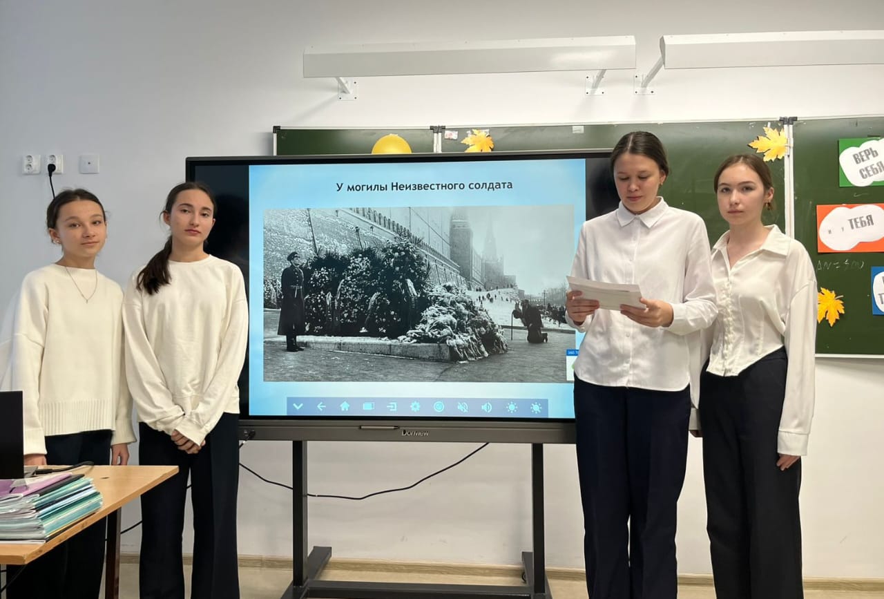 Мәктәп укучылары тәрбия эшләре буенча киңәшче Яруллина Г.И. белән бергә һәлак булган сугышчылар һәйкәленә шәмнәр кабыздылар һәм чәчәкләр салдылар. Шулай ук тарих укытучысы И.В. Малямова 8 А сыйныфы укучылары белән «Без сине хәтерлибез, Билгесез солдат» дигән батырлык дәресе үткәрде. Әлеге чара балаларга бу истәлекле датаның мәгънәсен тирәнрәк аңларга һәм тоярга ярдәм иткән мөһим һәм күңелне нечкәрткеч моментлар белән тулыланды.