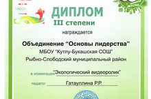 "Лидерлык нигезләре" түгәрәгендә тәрбияләнүчеләр «Шәһәр балачак яклавы астында» VIII Республика экологик реклама конкурсында катнаштылар һәм III дәрәҗә диплом белән бүләкләнделәр.