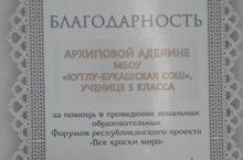 Ученице 5 класса Архиповой Аделине вручили благодарность за помощь проведения форума «Все краски мира».