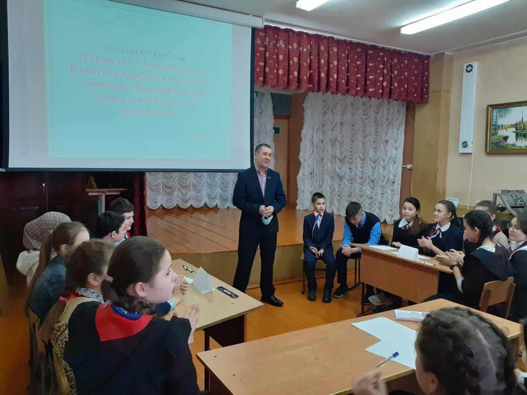 Опубликовано: 16.02.202116 февраля в рамках Парламентского урока – 2021, посвященный году родных языков и народного единства, на тему «Татарстан – наш общий дом. Единство народов, культурное и языковое многообразие как уникальное богатство республики» прошла встреча с депутатами местного самоуправления. Для учащихся 6-7 классов была проведена викторина «Туган җирем -Татарстан» .