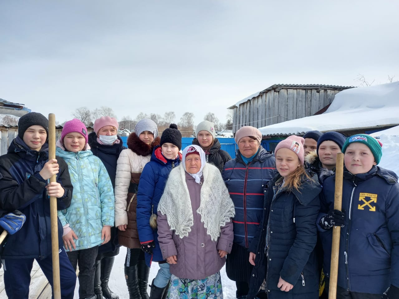 Тимуровская работа очень нужна, ведь престарелым людям иногда требуется не только помощь, но и просто внимание. В нашей школе тимуровская работа ведется уже много лет. 17 марта ученики 6 класса посетили ветеранов тыла и труда Закирову Х, Гибадуллину Н. и оказывали им посильную помощь: расчищали дорожки от снега, сбрасывали снег с крыши.