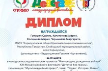 К 75-летию Великой Победы и 100-летию ТАССР члены краеведческого кружка под руководством Бадрутдиновой Г. участвовали в XXII Международном фестивале "Детство без границ" в номинации "Мультимедийный проект", тема "Подвиг. История. Жизнь". Работа удостоена Диплома III степени!!! Мы поздравляем руководителя Бадрутдинову Г.Н. с заслуженной Победой!!! Это результат большого профессионализма, каждодневного труда, порой бессонных ночей...Желаем руководителю и его сплоченной команде творческих успехов, здоровья, благополучия и неутомимого энтузиазма в достижении благородных целей в воспитании молодого поколения патриотов! Поздравляем!!!