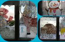 Помощники Деда Мороза оформили окна рисунками.