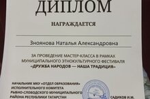 За проведение мастер-класса в рамках муниципального этнокультурного фестиваля "Дружба народов - наша традиция" наш воспитатель Зноянова Н.А. была награждена дипломом.