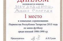С 06 - 07 ноября в Рыбно-Слободском районе проходили зональные соревнования по мини-футболу среди юношей 1998 - 1999 г.р. За выход в финал соревновались команды из Кукмора, Б.Сабов, Лаишево, В.Горы. В результате слаженной игры наших воспитанников - команда ДЮСШ в данной возрастной категории заняла 1 МЕСТО!!!