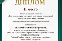Со 02 февраля по 06 марта 2026 года проводился Республиканский конкурс "Портфолио педагогических работников организаций дополнительного образования". В конкурсе, приняв участие, педагог дополнительного образования МБУ ДО "ДОО(П)Ц" Гилемханов Ильназ Рафисович занял 2 место.