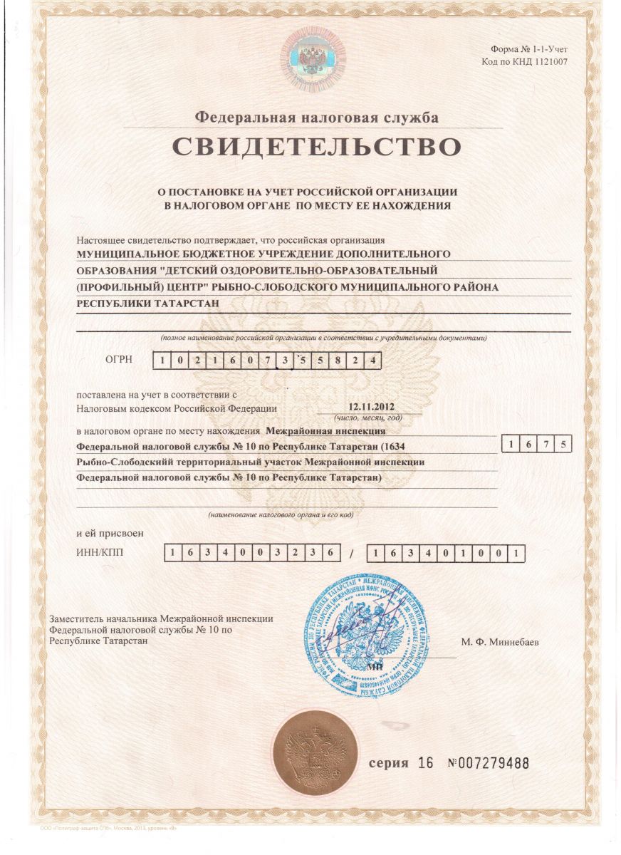 Свидетельство о постановке на учет Российской организации в налоговом органе по месту ее нахождения