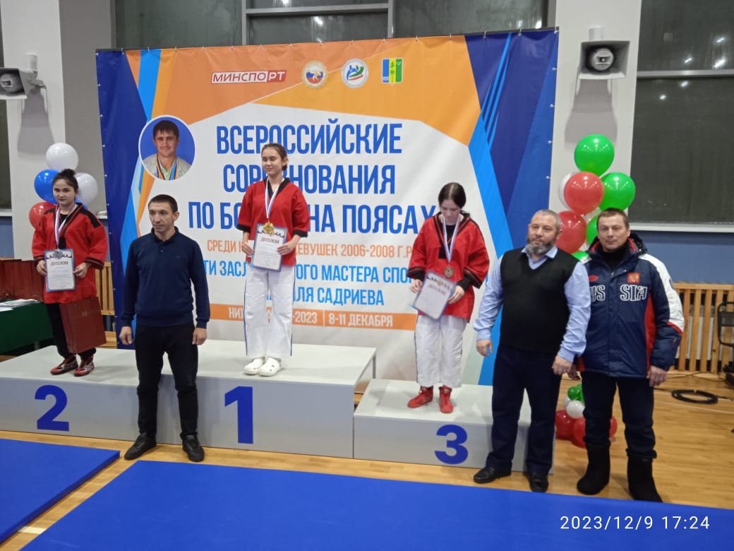 Воспитанники МБУ ДО «ДОО(П)Ц) Рыбно-Слободского муниципального района РТ под руководством педагогов дополнительного образования Шамсевалиева Г.Г., Гилемханова И.Р. и представителя команды Гиннатуллина И.И. приняли участие во Всероссийских соревнованиях по борьбе на поясах среди юношей и девушек 2006-2008г.р. посвященных памяти заслуженного мастера спорта России Шамиля Садриева, которые прошли в г. Нижнекамск с 8 по 11 декабря 2023г. Среди девушек в весовой категории 44 кг 2 место заняла Мухаммадиева Ралина (педагог Гилемханов И.Р.), 3 место заняла Мифтахова Дильбар ( педагог Шамсевалиев Г.Г.)