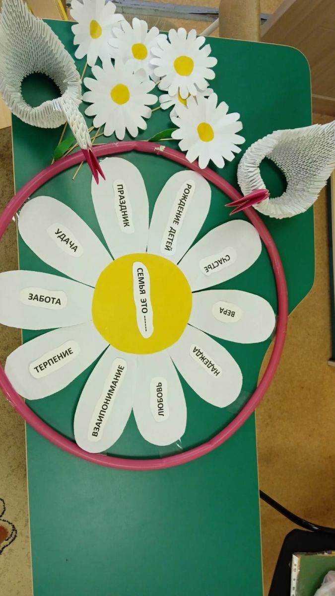 Гаилә сүзләр генә түгел. Бу әнинең җылы елмаюы, әтинең игелекле куллары һәм балаларның күңелле көлүләре. Бу символик көнне без гаилә турында сөйләштек. Әңгәмәнең максаты-якыныңа карата ярату һәм хөрмәт тәрбияләү. « Гаилә» ролен уйнадык, шулай ук кичке вакытта һәр гаилә өчен ромашкалар ясадык. Бу безне яраткан һәм көткән урын.