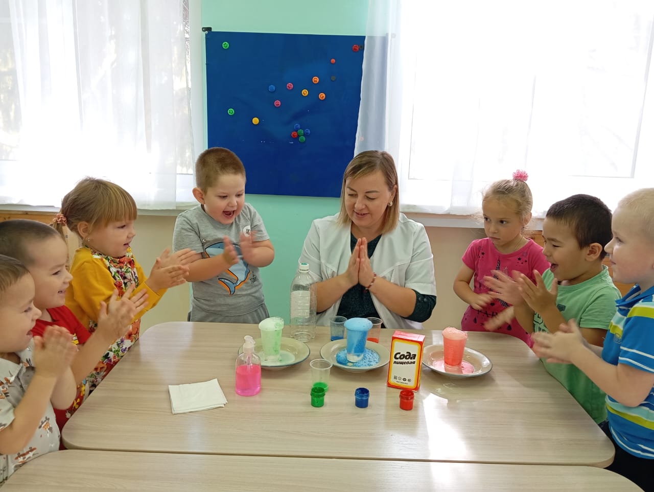 Ребята познакомились с историей появления соды и применением ее в быту, о ее волшебных свойствах. Также узнали, что, если добавить в соду уксус, можно надуть воздушный шар без любых усилий, сделать вулкан, извергающий лаву.
