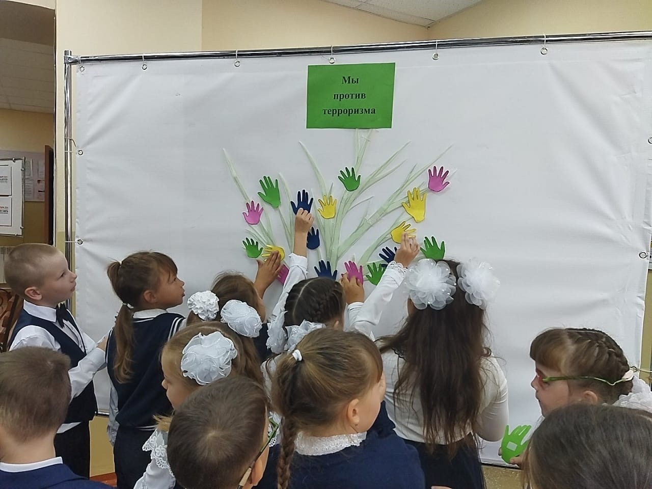 В рамках этого памятного события педагог-организатор Айгуль Сальмановна совместно с советником директора по воспитанию Диной Айдаровной провели акцию "Ладошки" с первыми классами.