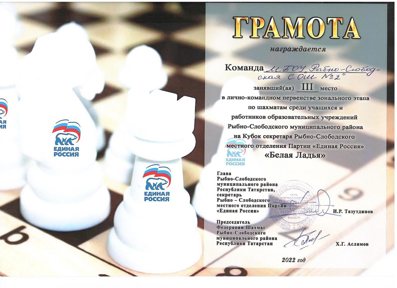 13 апреля прошел зональный этап по шахматам среди учащихся и работников образовательных учреждений Рыбно-слободского муниципального района Кубок секретаря Рыбно-Слободского местного отделения Партии «Единая Россия» «Белая Ладья». Команда нашей школы МБОУ «Рыбно-Слободская СОШ №2 заняла 3 место и прошла в финальную часть.