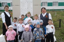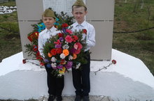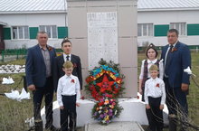 Сугышта һәлак булган авылдашларыбыз хөрмәтенә салынган һәйкәлгә венок салдык.