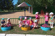 Бакчабыз тирәли күп төрле чәчәкләр утырттык, аларга су сибәргә, чүпләрен утарга апаларыбызга ярдәм иттек. Һәр көн бакчабызда шушы матурлыкны күреп сөенеп хәм сокланып йөрибез.