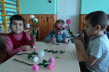 Тиздән "Аналар" коне җитә. Балалар кисеп ябыштыру шөгелендә әниләргә бәйрәм бүләге итеп чәчәкләр ясадылар.