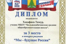 3 нче класс укучысы Ханафиев Тимур "Без-Россия киләчәге" темасына узган рәсем бәйгесендә 3 урын алды.