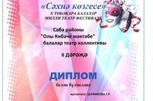 Мәктәбебезнең "Күңелле сәхнә" түгәрәге членнары (җитәкчесе Шафикова Г.Р.) "Сәхнә көзгесе" X ТӨБӘКАРА БАЛАЛАР МИЛЛИ ТЕАТР ФЕСТИВАЛЕндә катнашып, II дәрәҗәдәге Дипломга лаек булдылар. Котлыйбыз! Алда иҗади уңышлар теләп калабыз.