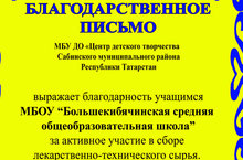 Районыбыз дару үләннәре тапшыру буенча Республика күләмендә II урынга лаек булды.Мәктәбебез укучылары да дару үләннәре җыюда актив катнашты."Рәхмәт хаты" тапшырылды.