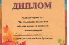 Районыбызда 11 нче тапкыр "Кабак бәйрәме" үткәрелде.Мәктәбебез коллективы бу бәйрәмгә ныклы әзерлек белән барды.тырышлыгыбыз үзен аклады."Иң тәмле кабак бәлеше һәм кабактан әзерләнгән ризыклар" номинациясендә II дәрәҗәдәге Дипломга лаек булык.